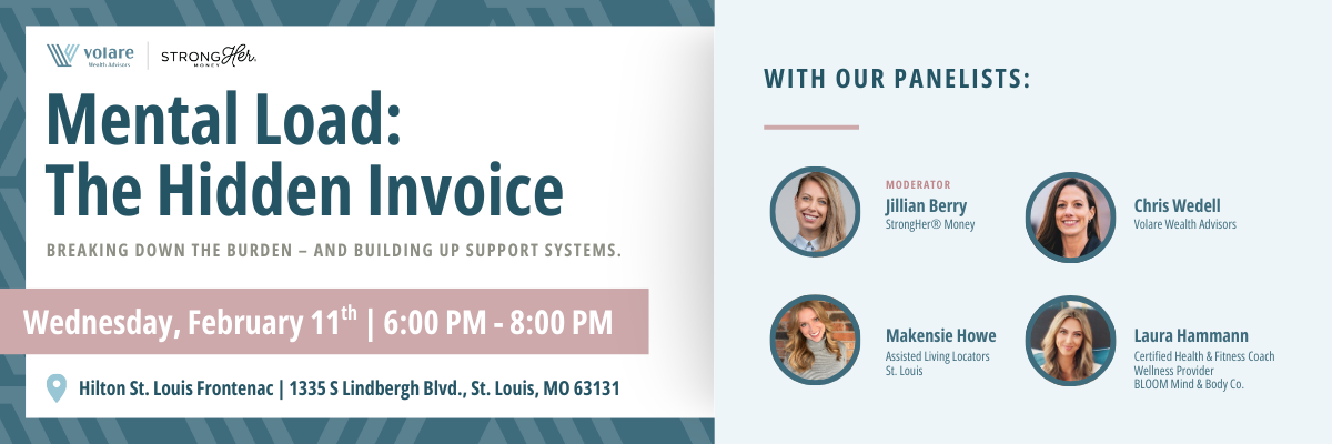 Join us for Mental Load: The Hidden Invoice at the Hilton St. Louis Frontenac on February 11th, 6–8 PM. This is a StrongHer Money® event, bringing women together to learn, connect, and live financially fearless.